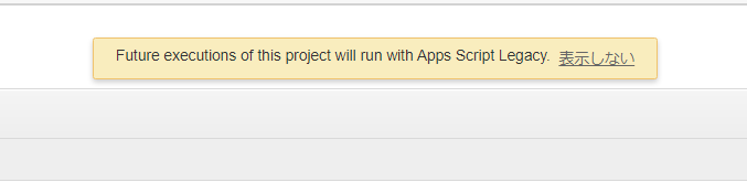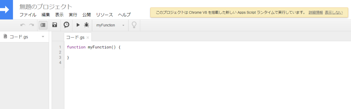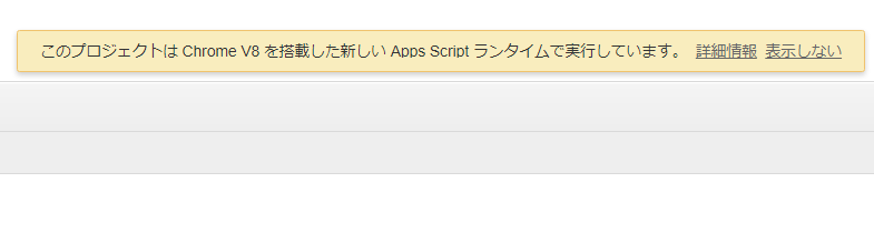 「このプロジェクトは Chrome V8 を搭載した新しい Apps Script ランタイムで実行しています。」というメッセージが表示されますが、今回は無視します(これについては「おまけ:V8 Runtimeについて」の項目で軽く説明します)。