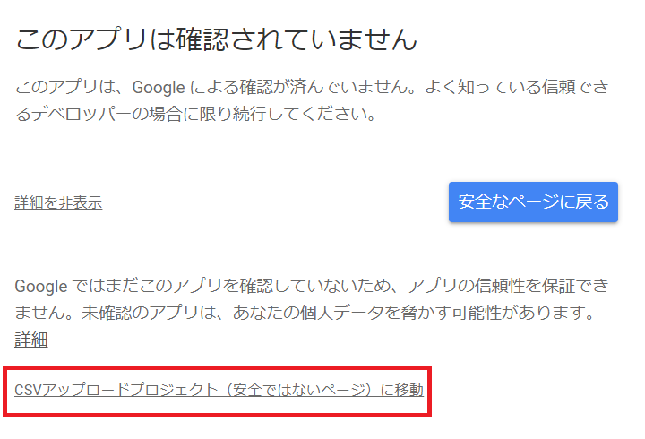 詳細の一番下にある「CSVアップロードプロジェクト(安全ではないページ)に移動」をクリックします。