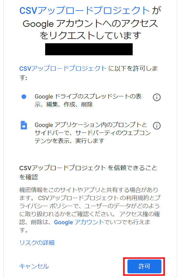 承認するアカウントと許可する項目が表示されるので、一番下にある「許可」をクリックします。