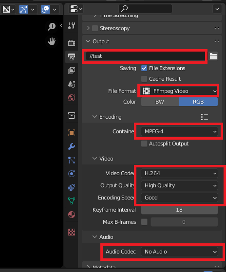 動画として書き出すために「Output」の各項目を設定します。今回は音声を消したかったので「No Audio」を選択しています。