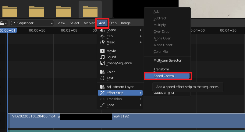 「Add」→「Effect Strip」→「Speed Control」を選択します。