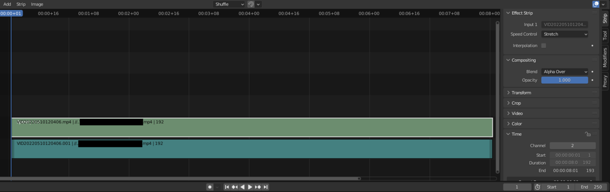 次に青色の映像部分をクリックした状態で右側にある「Time」→「Duration」のところに短くなった音声のフレーム数と同じ値を入力します。今回は192なのでその値を入力します。