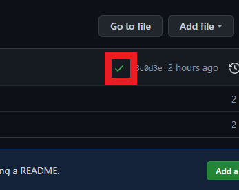 この黄色いマークはGitHub Pages用のビルドが走っている状態なので少し待ちます。待った後にページを更新すると以下のように緑のチェックマークが出ていればビルドが終了しています。